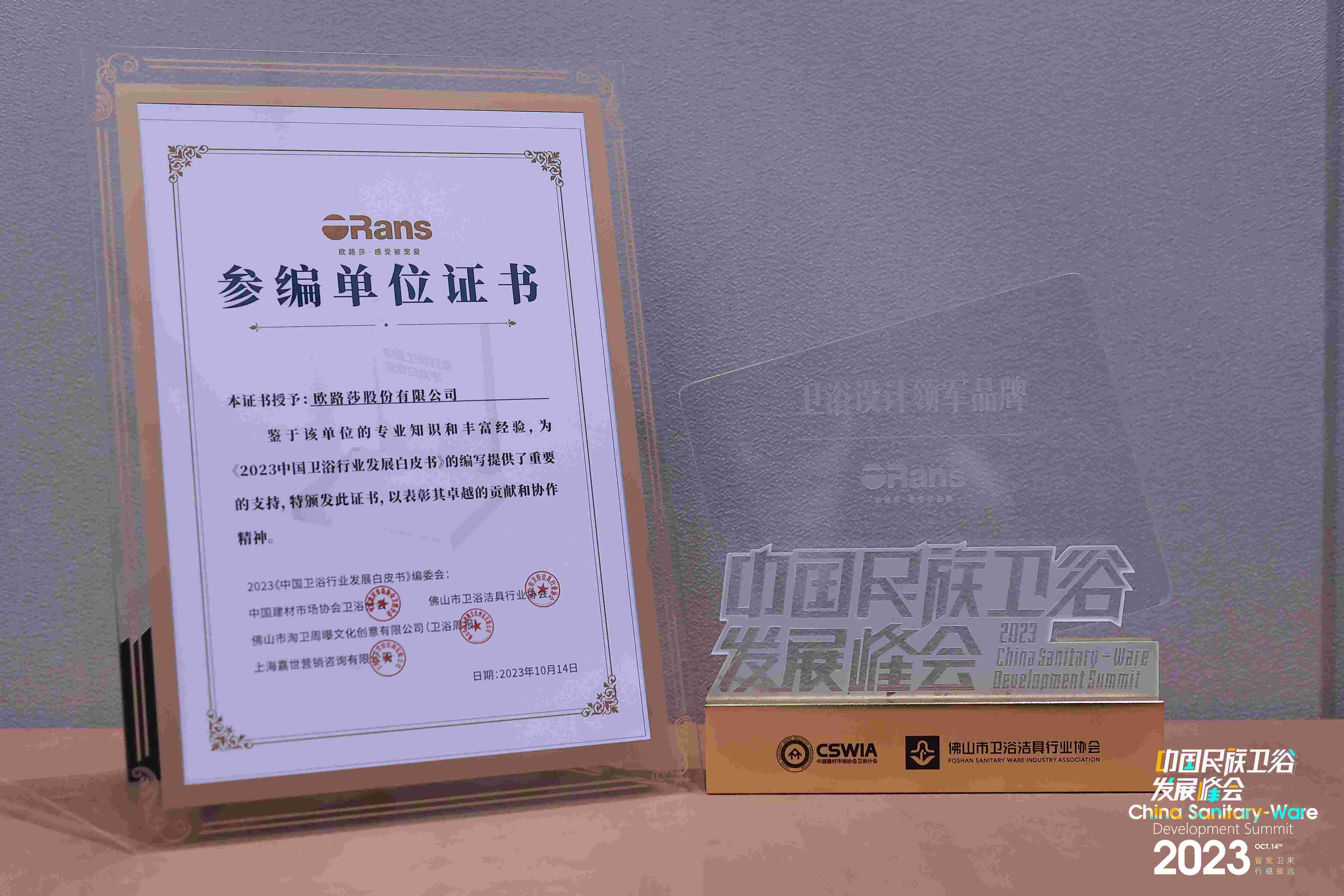 歐路莎衛浴再次榮登“中國衛浴品牌榮光榜”,奪得“衛浴設計領軍品牌”,并為編寫《2023 中國衛浴行業發展白皮書》提供重要支持,獲頒“參編單位證書”。