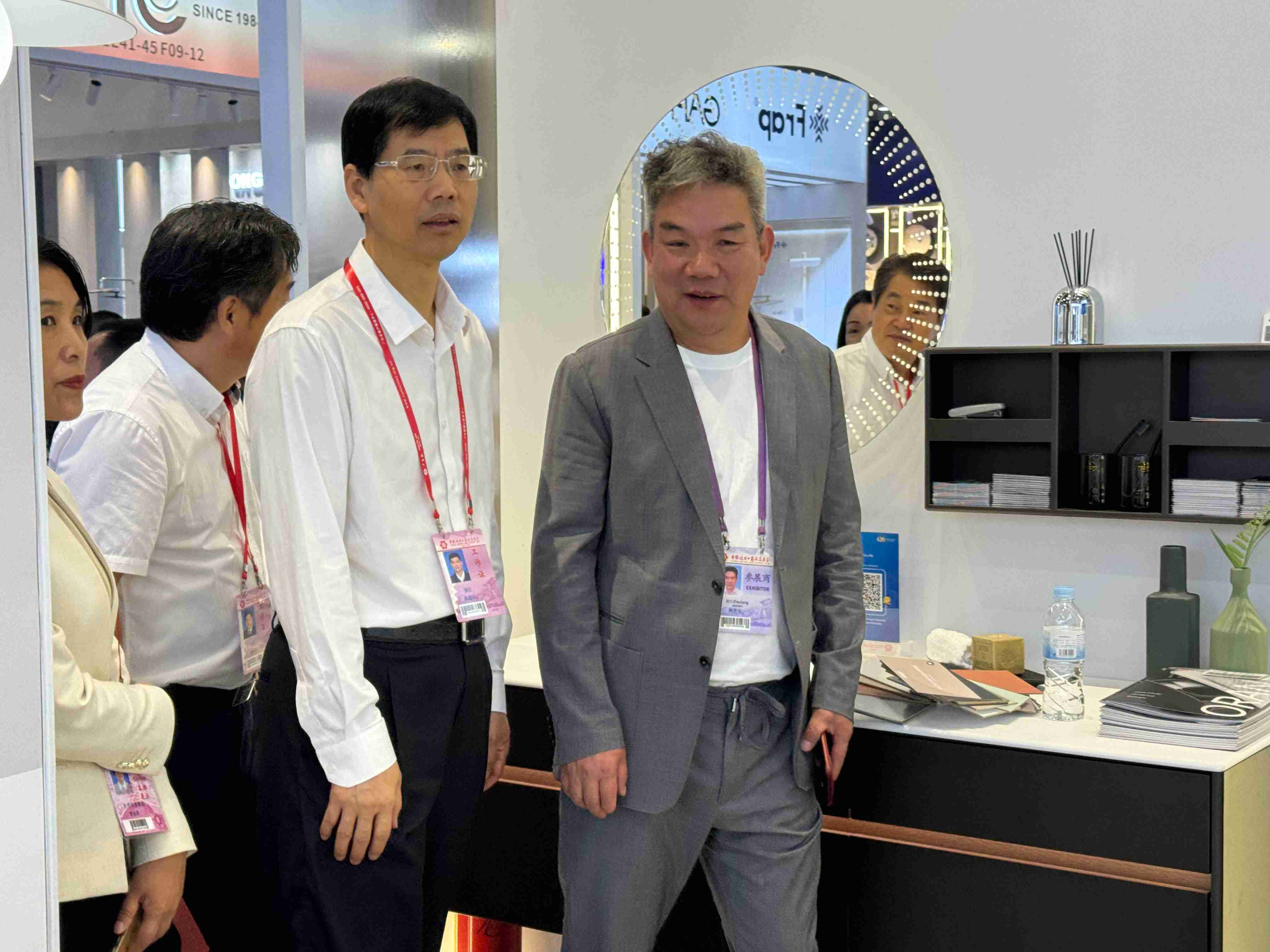 展會期間,歐路莎衛(wèi)浴作為浙江省重點出口企業(yè),備受政府各級領(lǐng)導(dǎo)關(guān)懷。24日上午,?浙江省貿(mào)促會黨組書記、會長陳建忠、臺州市梁麗萍會長等一行蒞臨歐路莎衛(wèi)浴展位考察調(diào)研,歐路莎董事長林華友熱情接待并陪同觀展。