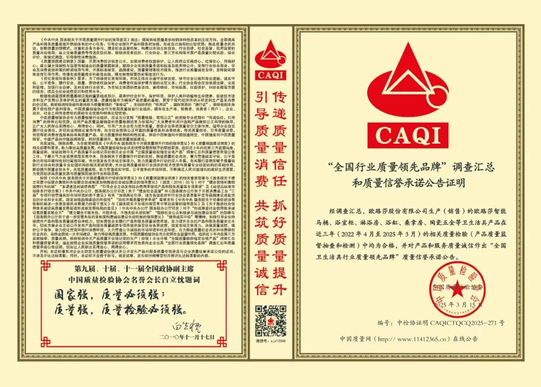 質量,是一個企業的生存之本,也是一個國家的強國之基。歐路莎專注高端智能健康衛浴27年,始終堅持“誠信為先,質量為本”的經營理念,堅守品質,不斷完善質量管理體系、履行企業質量責任,打造民族質量品牌,推動質量強國建設,在質量變革的大潮中,為新時代高質量發展做出積極的貢獻。