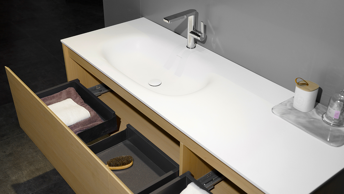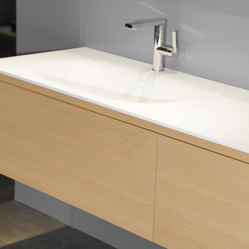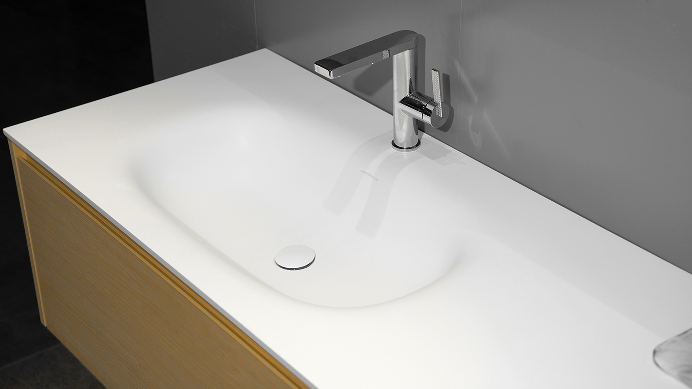 可麗耐一體臺盆,細膩溫潤的觸感,勾勒靈動純凈之美,極簡臺面設計, 減少整體的厚重感