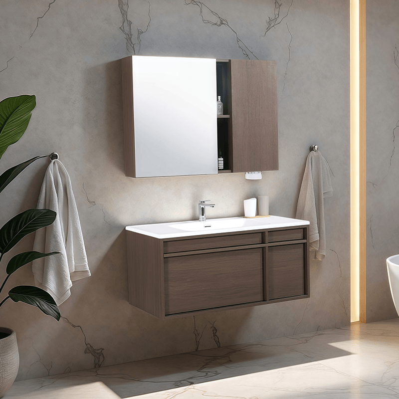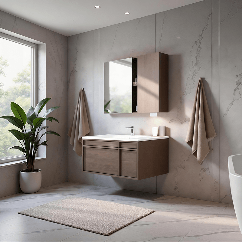 意式胡桃木的溫潤紋理,如流云掠過山崗,在方寸間勾勒出松弛又高級的浴室美學