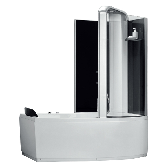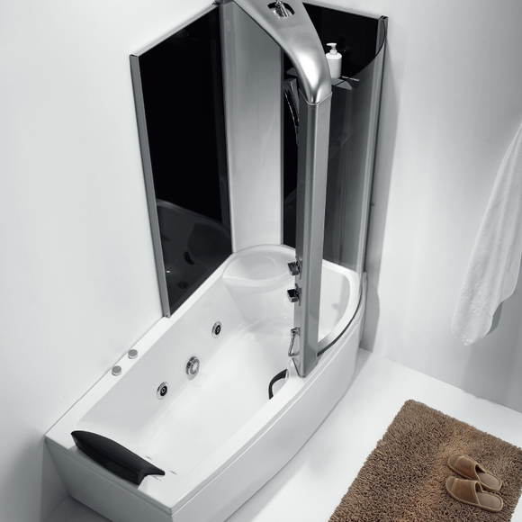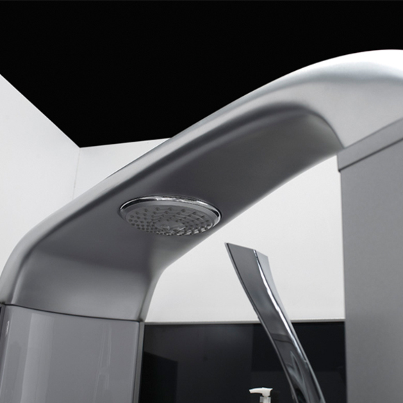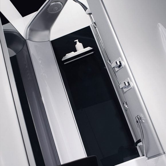 亮銀淋浴柱、深灰玻璃背板、置物架、頂噴、花灑、背噴、進水器、五金龍頭