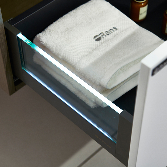 內(nèi)置LED燈帶的大抽屜,搭配開放式雙層置物格,按需收納,利用率更高。