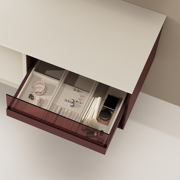 以珠寶精致的展示概念,采用細膩的內部隔層和柔和的燈光,為化妝品和首飾提供個性化的收納空間,讓每一次妝容打造都成為一種美妙的享受。